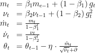 其中 为当前梯度, β1=0.9 、 β2=0.999 为动量参数, η 为学习率,