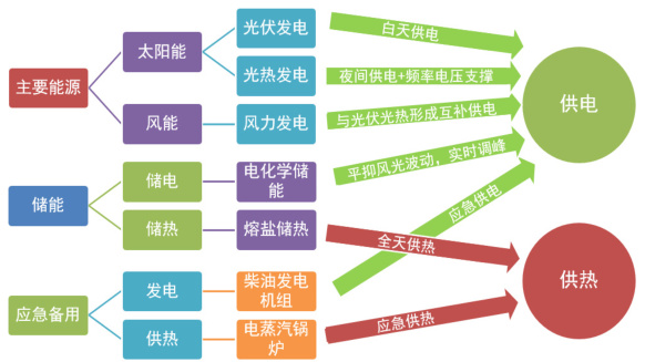 采用“光伏 + 风电 + 电化学储能 + 光热供汽(太阳能集热镜场 + 熔盐储热 + 换热供汽) + 电蒸汽锅炉 + 电熔盐加热器 + 柴油发电机组”的多能互补组合方案。