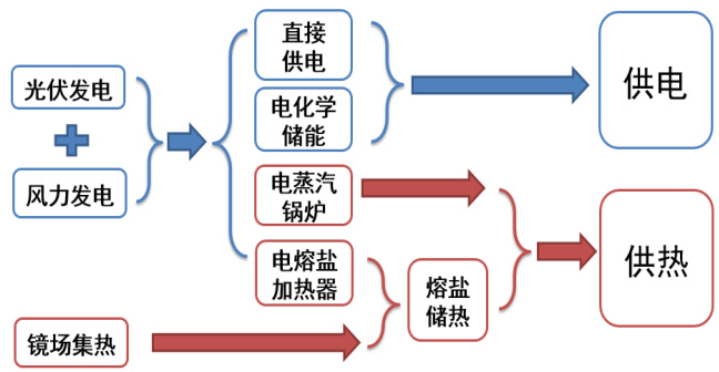 风力发电:风力发电与光伏发电互补,在光伏供电不足时优先供电,多余电量优先给电化学储能充电,剩余电量先由电蒸汽锅炉回收直接供汽,其余由电熔盐加热器回收进入熔盐储热系统。