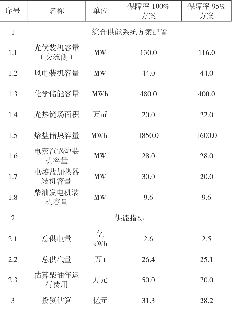 在供能保障率为 100% 、 95% 的边界条件下,综合供能系统方案配置容量、能源供应及投资情况详见表1: