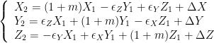 设源坐标系中的点坐标为( X1,Y1,Z1 ),目标坐标系中的对应点坐标为( ΔX2 ,Y2 , Z2 ),则布尔沙模型的转换公式为: