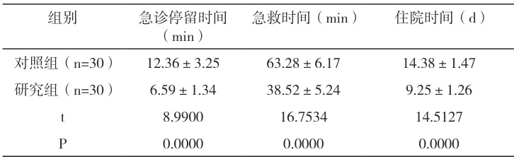 在本次研究过程中,主要观察两组患者的救治时间、救治效果以及护理满意度,其中救治时间主要包括急诊停留时间、急救时间、住院时间,救治效果具体包括显效、有效、无效三个级别,护理满意度包括十分满意、满意以及不满意三个级别。