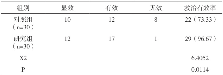 根据表 2 数据来看,研究组患者的救治有效率相对较高,与对照组患者差异明显( P<0.05 )。