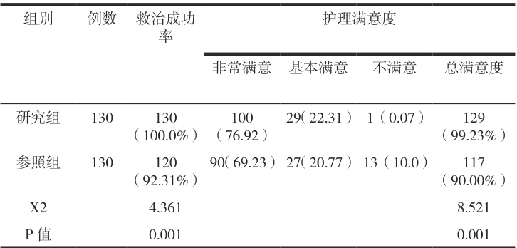 表1 所示,研究组救治成功率及护理满意度均高于参照组( P<0.05 )。