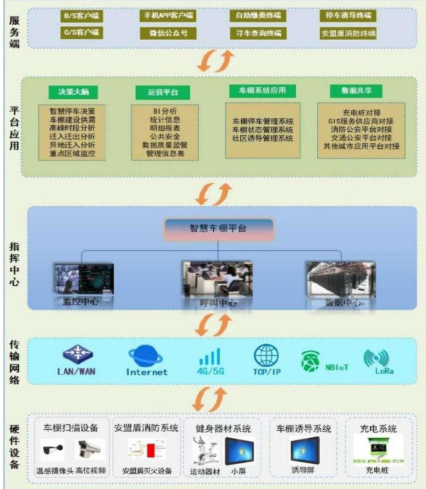 如下图所示,智慧车棚设计管理整体解决方案自下而上包括服务端、平台应用、指挥中心、传输网络和硬件设备组成。