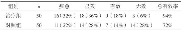 通过对两组患者的治疗总有效率进行对比,最终的结果也存在明显差异(详见表 2)。