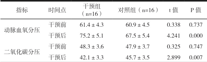 研究采用随机数字表法将 32 例患者平均分为两组,对照组和干预组各 16 例,干预组男性10 例、女性6 例,对照组男性9 例、女性7 例;平均年龄分别为 69.6±7.8 岁与 70.3±8.1 岁;COPD 病程干预组为 6.5±2.1 年,对照组为 6.7±2.3 年;吸烟史患者分别为11 例与10 例,合并高血压或糖尿病者分别为6 例与5 例。各项差异均无统计学意义( P>0.05 ),具可比性。