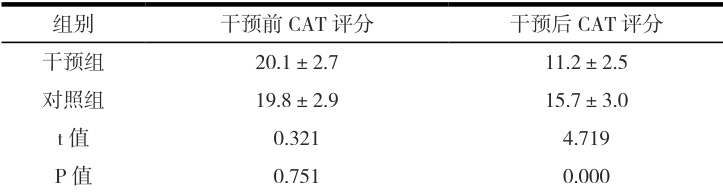 干预前两组评分差异不显著(P=0.751),干预后均有下降,且干预组降幅更为显著,对照组下降幅度相对较小,干预后CAT 评分的改善在干预组更为明显( P<0.001, )。