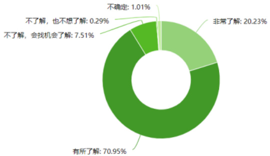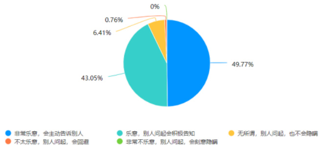 当地青少年不仅对中华文化有强烈的认同感,对自己的民族身份和民族文化也有很强的认同感。数据显示,对本民族的文化,包括服饰礼仪、婚丧习俗、饮食、行为习惯等,91.18% 表示非常了解或有所了解,7.51% 表示不了解,但会找机会去了解,只有 0.29% 表示不想了解(如图 1)。当向别人作自我介绍时,绝大部分青少年都会乐意让别人知道自己的少数民族身份,选择刻意隐瞒的人数为 0(如图 2)。访谈过程中也了解到大部分青少年都以自己的少数民族身份为傲,会主动学习少数民族文化,同时也认同中华民族传统文化,支持各民族间加强交往。