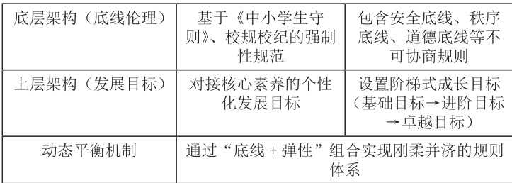 传统班规多采用“禁止性规范”范式,强调对个体行为的规训与惩罚。本研究突破二元对立思维,将班规定位为班级成员共同缔结的成长契约,其本质是学生社会化进程中自我立法的实践载体。通过建立“底线伦理 + 发展目标”的双层架构(见图 1),既保障班级秩序的刚性约束,又为个性发展预留制度空间。