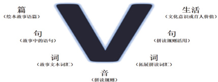 基于绘本的自然拼读 V 型教学模式课程规划(图 3)融合教材 Let’sspell 内容,是我校特色课程,吻合学校“生长课程”体系,为培养有优良品德、学习能力、艺术修养、创新智慧的宏景学子启智润心。
