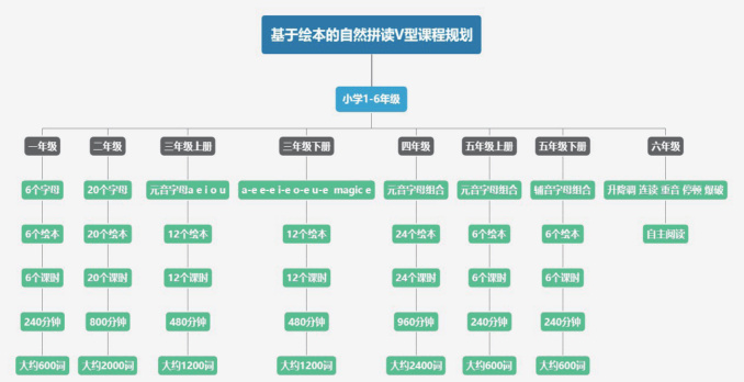 V 型模式课程规划一至六年级,以丽声北极星和攀登系列拼读绘本为主,其他资源为辅。六年下来,学生能学习大约 3440 分钟、86 个拼读绘本,掌握86 种拼读规则,习得至少8600 词,再加自主阅读积累,能达到9000-10000 词。而 2022 版课程标准二级、二级 + 语言技能中理解性技能“9. 课外视听活动每周不少于 30 分钟;10. 课外阅读量累计达到 4000-5000 词。”基于绘本的自然拼读 V 型课程规划,使学生的积累量远远超过课标要求,能为后期的学习奠定良好的基础。