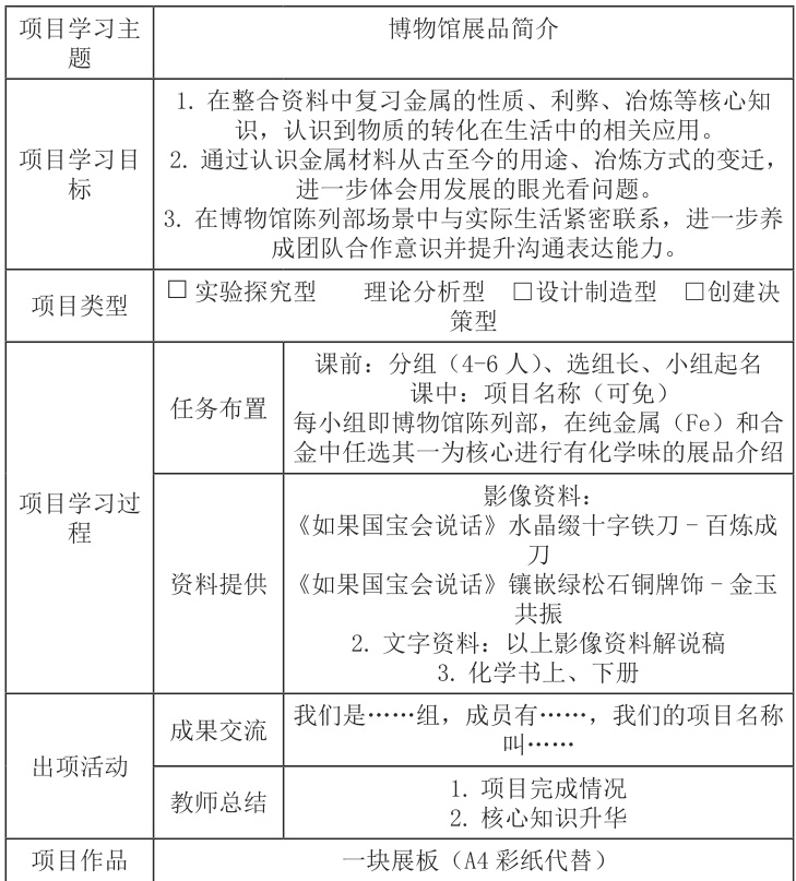 教研员在前郭县范围内开展一节微项目学习 [2] 示范课《博物馆展品简介——第八单元复习》中,直观展示了任务设计、过程评价等关键教学环节,并形成微项目教学方案参考模板(如表 1),以便在更大范围内推广应用。从课堂效果和听课教师的反馈来看,无论是城镇还是农村的学生,课堂参与度都较高。通过设计多元化的任务并实施过程性评价,能够有效提升学生的学习主动性,农村学生同样展现出很强的创造性,能够快速进入深度学习状态。