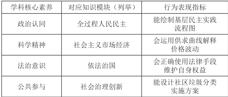 按照学科核心素养的四个维度,即政治认同、科学精神、法治意识、公共参与,可将抽象素养转化为具体学科内容,从而建构起内容维度的四位一体分目标结构。如图1 所示: