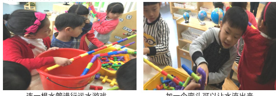 是有了利用水管玩具运水的游戏;幼儿运用生活经验进行两头相连,同时探索弯头与直管的区别,弯头可以