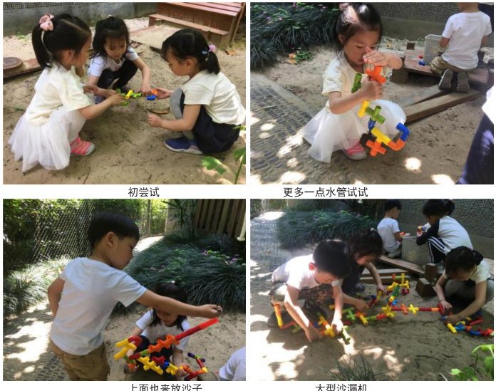对于沙子,幼儿是特别喜欢的一种玩具,但是对于把沙子和水管一起进行游戏也是一种新奇的体验和挑战。沙子的建构限于堆、挖、藏等,但与水管相结合,就有了各种拼搭、体验,幼儿兴趣以及想象力的提升,动脑和动手能力的发展都能更明显的体现出来。