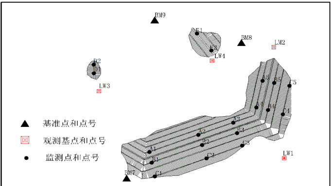 龙王顶尾矿库主坝坝高 55 米,根据坝体地面起伏较大、落差较大的实际情况,对测区的监测点布设进行相应调整,布设 4 个观测基点,19 个监测点,监测点的布设如附图所示。监测的内容为观测点的移动量、沉降量。