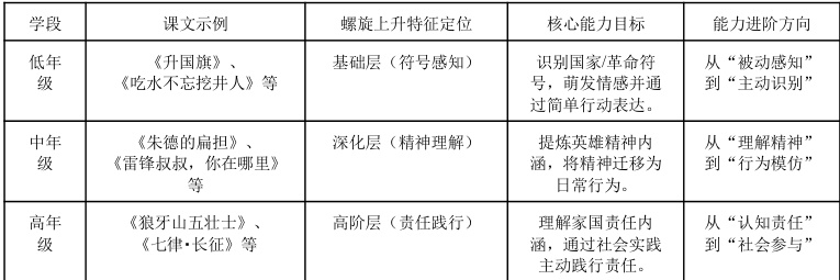 统编版小学语文红色课文按照“符号感知—精神理解—责任践行”的逻辑进行螺旋上升式编排,这一编排方式精准对应了小学生能力发展的规律,呈现出“基础感知—迁移应用—主动践行”的能力进阶显著特征。