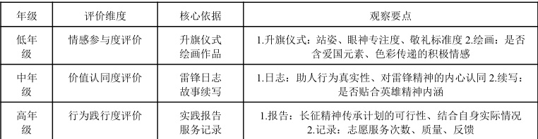 基于不同学段学生的认知特点与成长规律,评价需呈现阶梯式聚焦:低年级侧重情感参与度,通过实践活动中的表现性评价记录学生对国家符号的情感共鸣,为教学调整提供依据;中年级侧重价值认同度,借助各类成果分析其对英雄精神的理解与认同深度,助力价值观成长;高年级则侧重行为践行度,通过报告与记录评估家国责任向具体行动的转化效果,激励实践中进步。
