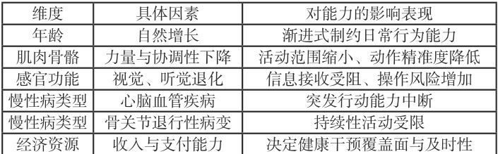 生理机能的自然衰退构成影响老年人能力变化的核心内因。年龄增长带来的多重生理变化对日常行为能力构成渐进式制约影响,肌肉力量协调性下降直接限制活动范围与动作精准度。慢性病累积导致的视觉听觉功能退化改变信息接收处理模式,增加操作风险空间[2]。基础疾病类型分布差异使得功能障碍呈现明显个体化特征,心脑血管疾病人群面临突发的行动能力中断风险,骨关节退行性病变群体长期受到持续性活动受限困扰。经济资源可及性程度决定着健康干预措施的覆盖面与及时性,直接影响康复进程效率与社会参与范围边界(见表 1)。这些内源性变量形成的复合机制深度参与能力维持路径。