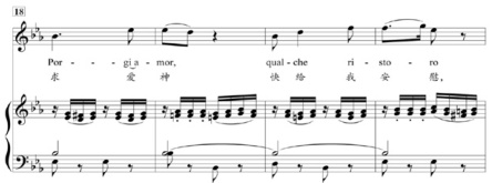 伯爵夫人因丈夫不忠陷入了感情困境中,A 段的自我独白是伯爵夫人独处时的内心倾诉,在演唱过程中姿态可微垂眼帘,模拟抽泣时的虚弱感。B 段与剧情中她对婚姻挽回的渴望呼应,演唱旋律的对比需要配合身体微微前倾的动作,仿佛在向爱神伸出祈求之手。在“Porgiamor,qualche ristoro”(求爱神给我安慰)处由弱起到渐强,仿佛从喃喃自语到放声祈求,强化戏剧冲击力。A’段再现时旋律略有变化,对应她意识到希望渺茫后的无奈,演唱时眼神需要放空,与音乐的渐弱形成肢体语言的呼应。
