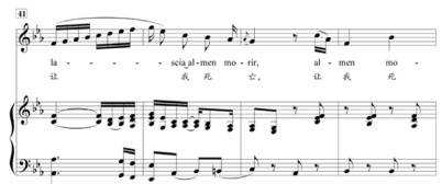 在第 41 小节处有一个延长音(谱例 2),在演唱这个乐句时,重点在于控制好气息,保持连贯流畅的呼吸方式,同时准确清晰地表达意大利语歌词,并将咏叹调中的情感细腻地呈现出来。通过良好的气息控制和准确的咬字,演唱者能够更好地展现出作品的魅力,打动观众的听觉和心灵。