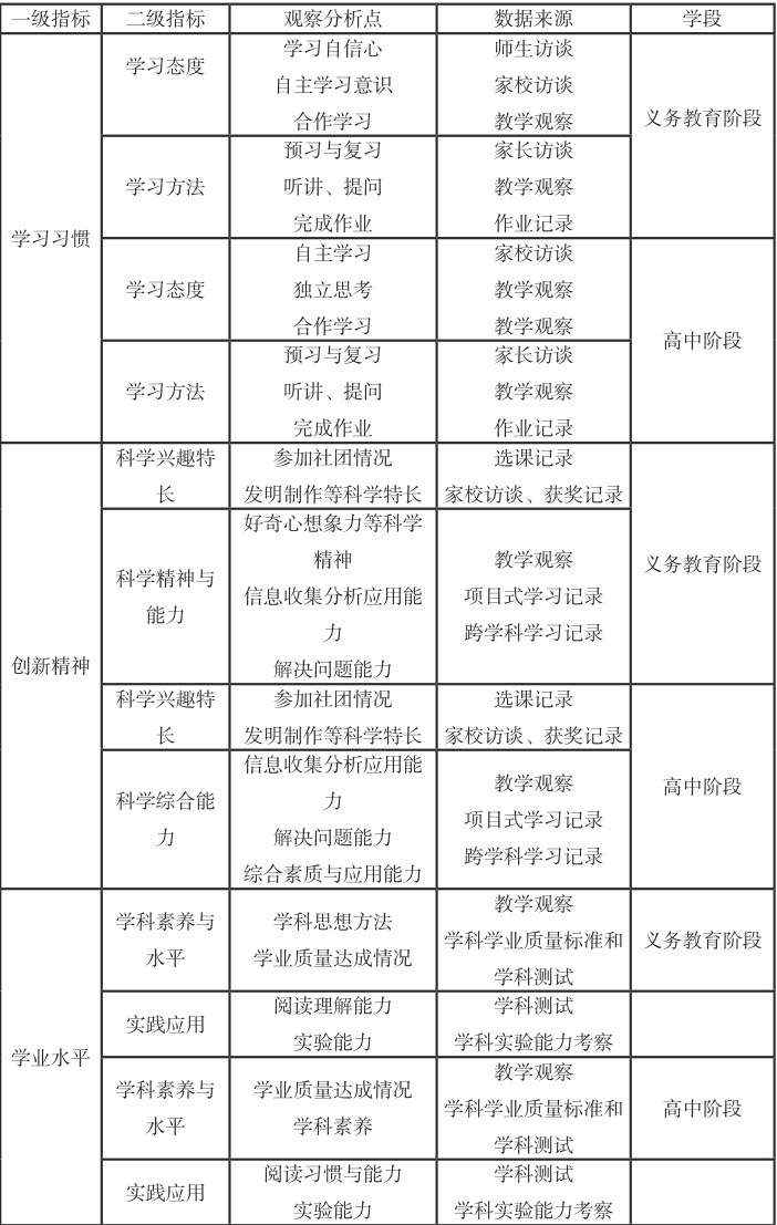 学业评价理念的更新与变革,不仅受限于教育工作者的总体教育理念和专业视野,而且对评价模型的构建、评价工具的变革与优化产生影响。《义务教育质量评价指标》和《普通高中学校办学质量评价指标》对学生学业发展状况提出了具体要求,涵盖“学习习惯、创新精神、学业水平”三个维度,对学生发展评价比较全面,但有的内容尤其是关于学业水平的描述比较笼统,实际操作中难以量化,需要结合学生学段发展特征进行细化分解并聚焦典型特征进行分析。例如,关于学生学习习惯,《义务教育质量评价指标》和《普通高中学校办学质量评价指标》都强调学生应保持积极学习态度,掌握有效学习方法,善于合作学习,努力完成学习任务,不同的是,义务教育阶段对于学习习惯的描述更为具体,比如“主动预习,认真听讲,积极思考,踊跃提问,及时复习,认真完成作业”,以及“具有学习自信心和自主学习意识”等,而高中阶段在整体强调学生要形成良好的学习习惯基础上,更加重视学生自主学习、独立思考的能力,体现了随着学生学段的提高对于学习习惯要求的变化,需要在分解相关述评内容时进行细化体现。