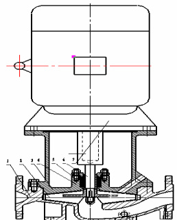 1-泵体 2-叶轮 3-电机支架 4-轴套 5-填料 6-轴 7-立式电机