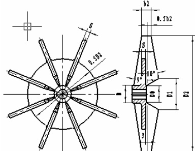 叶轮结构图见图3,叶轮的主要水力尺寸计算按照高速部分流泵的设计方法并结合我站已有的实用新型专利技术(一种自吸泵,专利号ZL201120043452.X)的成功经验来计算如下: