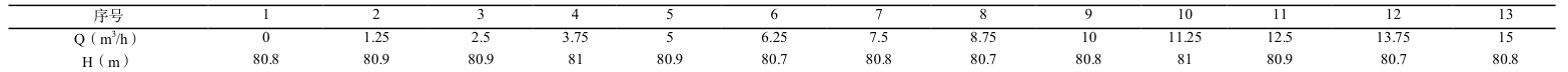 WG50-250 型立式污水泵组装完成后,在水泵试验台测试,泵设计点性能为:流量 Q=12.5m3/h ,扬程 H=80.9m,转速 n=2900r/min ,效率 49% ,轴功率Pa=5.6kW,气蚀余量 NPSHr=2.5m ,泵 Q~H 流量扬程曲线平直,具有变流稳压的特性,由于泵有流量中断特性,泵在最大流量为 15m3/h 时的轴功率 Pa=5.8kW,泵配 7.5kW 的立式电机也不会过载,测试的对应流量扬程见下面表1: