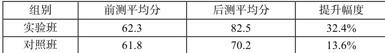 实验前,实验班和对照班学生空间认知能力测试平均分分别为 62.3 分和 61.8 分,差异不显著( p>0.05) 。实验后,实验班平均分提升至 82.5 分,对照班平均分提升至 70.2 分,实验班成绩显著高于对照班( p≤0.05 )[6],表明 AR 技术教学对学生空间认知能力提升效果明显,见表 2。