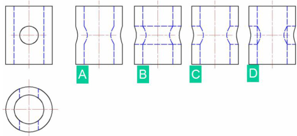 其次练习题的设计要有针对性,通过总结线上课堂中相关知识点测验的答题情况,针对出现问题较多较普遍的知识点设计题目,且可把学生较多的错误现象作为选择题中的选项,让学生对于错误有更深的认识,可避免再次出现该种错误。图1 所示为考查细点画线画法规范的课堂练习题,细点画线的画法是工程制图绘图的最基本规范,但刚接触工程制图的同学不具备严谨细致的工程素质,没有严格遵守规范的意识,设计这个课堂练习,且将常见错误列在选项里,可以提高学生对于工程意识的重视。图 2 所示为考查空心圆柱的相贯线画法的课堂练习题。工程制图课程中立体的表面交线是其中一个难点,特别是相贯线。图 2 中练习题设计的错误选项都具有代表性,其错误处也是学生对于相贯线理解的难处,结合该练习题的讲解可以更好的提高学生对于相贯线正确画法的掌握。