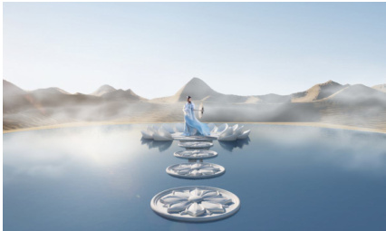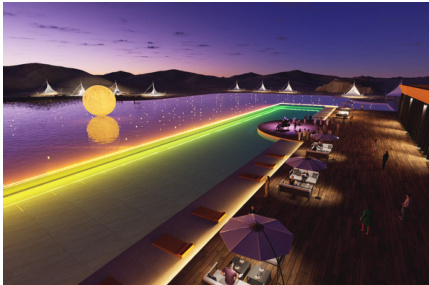 2)、驼铃泉:位于沙漠方舟与沙漠之间衔接位置,设计在原有沙漠方舟木平台往沙漠方向,设置泳池与戏水池场地,泳池与戏水池相接,且由玻璃隔开。泳池包含浅水日光浴区域与深水游泳区域。戏水池水深控制在 300mm,场地核心位置设置仿铜雕的驼铃泉雕塑,驼铃上部设置喷泉高水柱,成为驼铃泉的空间视觉制高点,烘托沙漠响泉的热烈氛围。驼铃泉往沙漠方向另设有木平台区域,可设置阳伞座椅组合,将休憩点推向沙漠边缘。驼铃泉作为沙漠之门打造的重点区域,采用大面积水域的形式,与沙漠炎热干旱的形象形成强烈反差。不同的游赏方位倒影出沙漠方舟、波浪沙丘、湛蓝天空,使整个空间充满灵动感。可参与的水域空间,为场地活动开展提供了更多可能性。景观亮化设计更加注重驼铃泉的夜景氛围营造,静谧氛围时突出驼铃形态的纯粹感,结合戏水池星光斑驳的效果,泳池通透的蓝色氛围,唯美宁静;节日时灯光结合喷泉律动,变换的星光色彩,营造热闹氛围。