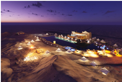 扩大原有水域面积至一万两千平方米的驼铃泉,驼铃泉名字取自引领沙漠之舟骆驼驼队前行的号角--驼铃,泉字寓意沙漠之水生生不息,长久流淌。此次在沙漠中用珍贵的水资源来与无垠的沙漠形成鲜明对比,让游客在干燥的沙海中寻得一片休憩的乐土。4 沙漠之门