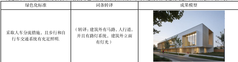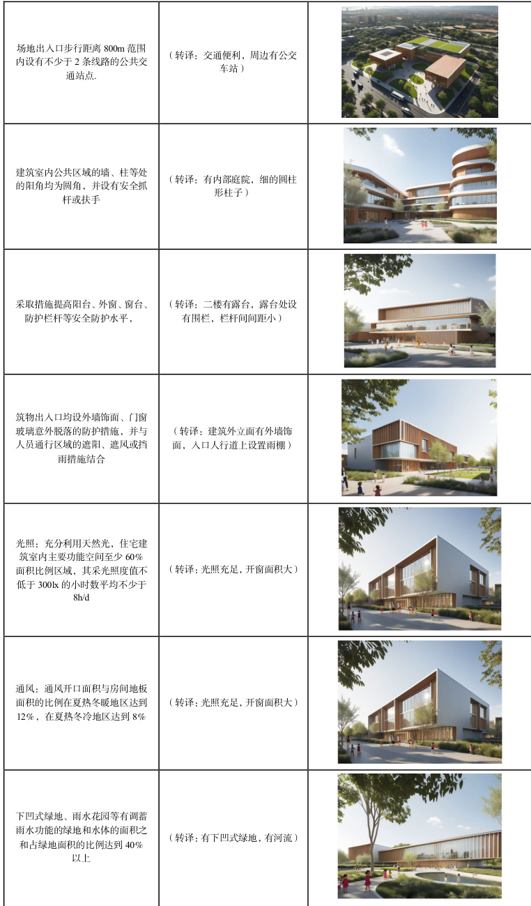 研究过程中,我们使用各种 AI 软件试验,尝试让 AI 生成的东西符合要求。以下为研究结果。第一,AI 辅助设计通过计算机逻辑控制训练数据准备,首先需要学习已有数据(建筑图像数据、对应条件文本数据等等),然后使用训练好的网络模型输出结果,其中可以通过增加学习数据的数量和类型来提高训练好的网络模型的通用性;最后可以通过数据源获取所需要的数据信息。第二,通过查找到的各项规范和标准总结绿色建筑相关词条,以这些相关词条作为 AI 生成的要求,而在研究过程中,以幼儿园生成为例子,我们将绿色环保标准分为三部分:布局、建筑单体与建筑周边。具体研究如下表(表 1)