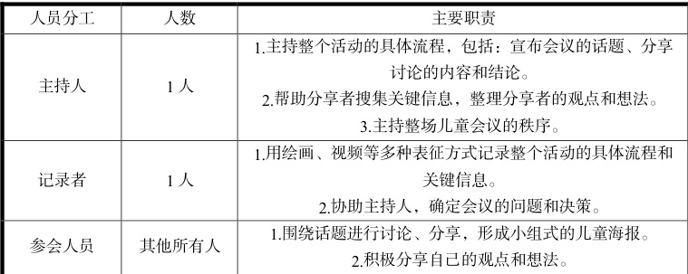 儿童会议的人员为三类:幼儿、教师、其他(家中成员、社会人员、长辈等其他根据具体的会议话题推荐的人员)人员具体分工包括:主持人、记录者,其余代表均为参加会议的人员。随着大班幼儿能力的不断增强,主持人与记录员多由幼儿自主承担。教师往往承担观察者和评价者者的身份,可以和幼儿共同讨论也要负责会议的文字记录和视频记录。