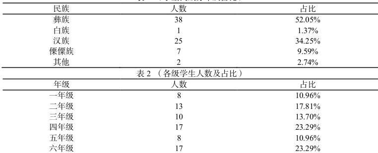 桑不老完小的学生总数为 73 人,年级分布不均,四年级和六年级人数最多(各 17 人),一年级和五年级最少(各 8 人)。彝族学生占比超过一半(表 1 学生民族分布及占比),从学生人数波动上(表2 各级学生人数及占比)反映出了生源不稳定的问题。