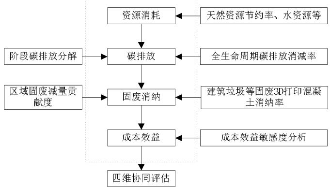 以国际标准化组织(ISO)提出的全生命周期评价(Life Cycle Assessment, LCA)理论为核心,结合市政管廊工程特性,构建“资源消耗-碳排放-固废消纳-成本效益”四维协同评估模型(图1)。该模型通过量化分析建筑垃圾3D 打印再生骨料混凝土(3D-RAC)在原材料获取、生产制造、施工建造、运营维护及报废回收全阶段的环境影响与经济效益,揭示其相较于传统现浇混凝土技术的绿色优势。