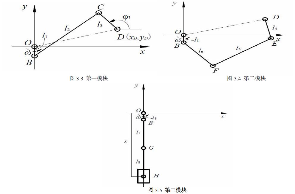 本研究运用复数矢量解析法对八杆杆组机构开展运动学分析。该方法将机构简化为封闭的矢量多边形,通过复数表达式建立机构的矢量闭环方程。具体实施时需将方程中各矢量在直角坐标系内进行投影[1],从而构建相应的方程组进行求解。按解析法的分解原则,将该机构拆分成三个模块(二级机构),如图3.3、3.4、3.5 所示。各模块为基本杆组,具有标准解,便于函数调用[8]。对三模块分别进行运动分析,得出运动学方程。