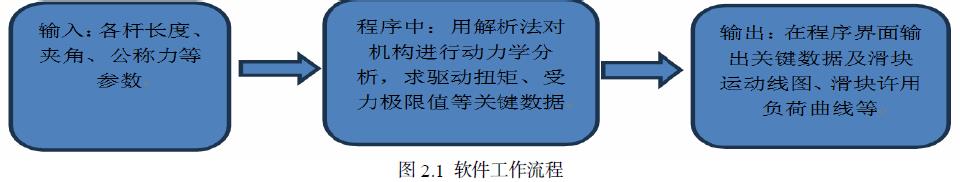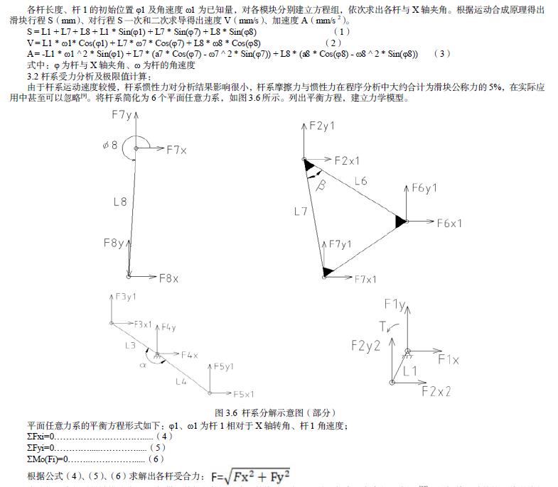 程序完成后,只需要输入已知参数,即可由程序建立数学模型并求解,可输出滑块的行程、速度、加速度曲线、许用负荷曲线及杆系的受力曲线。省去了杆系设计中复杂的求解判断过程,且结果显示直观,大大降低了设计工作量和难度。