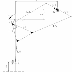 L1.偏心轮 L2.上拉杆 L3.上摇杆 L4.下摇杆 L5.下拉杆 L6&L7.角架 L8.连杆