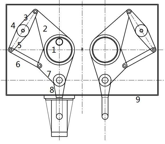 1.偏心轮 2.上拉杆 3.上摇杆 4.摇杆轴 5.下摇杆 6.下拉杆 7.角架 8.连杆9.横梁体