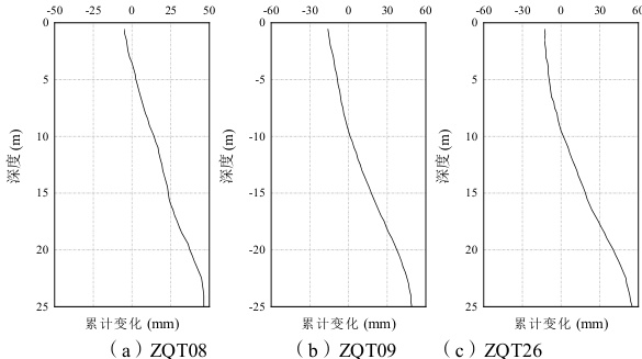 为判断换撑优化的有效性,对拆除第五道支撑后一周内浦口万汇城站主体结构的变形监测数据进行了统计。为节省篇幅,本文仅对主体结构第四段内存在围护结构监测点 ZQT08、ZQT09 和 ZQT26 进行分析,监测结果如图 2 所示。从三个监测孔数据来看,基坑在拆除第五道支撑后一周内的最大累计测斜为 55.7mm ,相较拆撑时的累计最大变形增加较小,基坑变形较稳定。可见,本文提出的换撑优化效果较好,能满足换撑设计要求。
