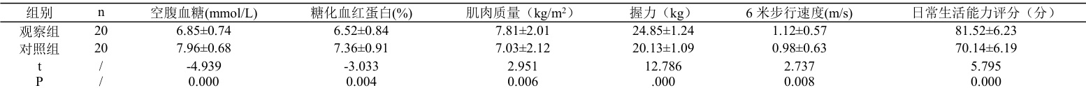 观察两组空腹血糖、糖化血红蛋白、肌肉质量、握力、6 米步行速度及日常生活能力评分
