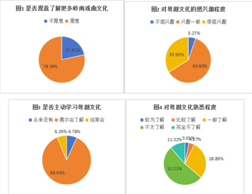 从图1 至图 4 可知,78.39%被调查学生表示愿意学习了解更多的岭南戏曲文化,33.93%被调查学生对粤剧文化很感兴趣,6.29%被调查学生有在平时生活中会主动了解粤剧文化,但只有 3.01%的学生表示较为了解粤剧文化,能够较为清楚地讲述粤剧的主要特点、艺术特征。由此看来较多学生还是愿意学习了解粤剧文化,但是对粤剧文化的认识和学习存在缺乏系统性了解。譬如,部分同学都听过“落花满天蔽月光”的音乐旋律,但是对于这段旋律出自哪?出自粤剧哪一部经典作品等问题是一概不知。地方文化的普及与传承缺乏成效主要原因有:一是现阶段大部分职业院校甚至本科院校,对粤剧文化乃至传统文化的普及教育只停留 入为音乐基础课的其中一部分,如材内容更多是倾向于简短介绍性内容。 粤剧粤曲(戏曲)为特色的学生社团 院校 文化育人体系在传统文化浸润方 在认知浅表化、融合碎片 剧文化底蕴深厚的粤西地区院校)在推 互动性,激发学生的文化探究兴趣,引导其从多维度 深层次感 实的文化认同与自信
