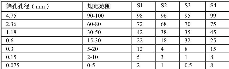 由表 1 可知,S1 各筛孔通过百分率均符合规范,为连续级配;S2 在 0.3mm 筛孔通过百分率略低于规范下限,级配偏粗;S3 在 0.6mm 筛孔超上限、 0.15mm 筛孔低于下限,为间断级配;S4 在 0.075mm 筛孔远超上限,级配偏细。