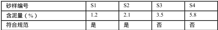 表 2 显示,S1 含泥量 1.2% (符合规范 ≤3% ),S2 为 2.1%( (符合),S3 为 3.5% (略超),S4 为 5.8% (远超)。差异源于地质条件:S1 产自花岗岩风化区,泥质少;S4 产自河流中下游,泥质沉积多。