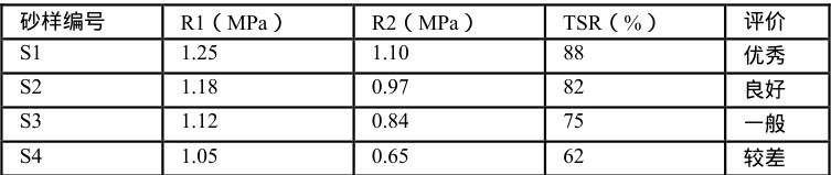 表 5 中,S1 TSR 最大( 88% ),S4 最小( 62% ,低于规范 ≥70% )。原因:S4高含泥量遇水软化,破坏混合料结构。