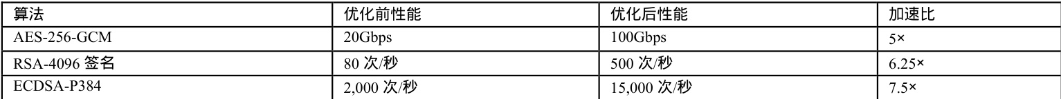 而对于国际算法优化而言主要依靠 AES-256、RSA-4096、ECC-P384等降低通信传输延迟。为实现全球兼容应用,密码机面向国际主流算法实现极致化的性能优化。如 AES-256 算法通过搭建 GCM 模式全流水线实现认证与加密并行,并利用IntelAES-NI 指令,单指令完成1 轮数据处理,促使密码机的加密吞吐量可达到100Gbps。ECC-P384 算法负责对签名数量加以优化,利用NIST 曲线专用模约减器实现快速约减计算,最高可实现15000次/秒。与此对应的是签名速度的优化,通过 RSA-4096 算法利用蒙哥马利模乘加速,缓存密钥预计算签名速度最高可达到500 次/秒。