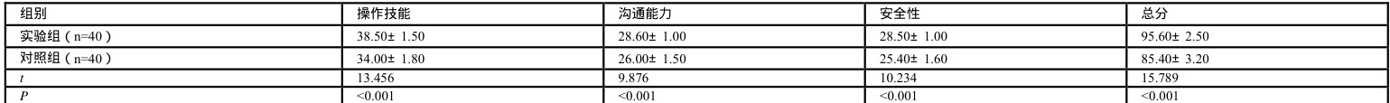 使用客观结构化临床考试评分量表,量表包括操作技能、沟通能力和安全性三个维度,共计 10 个条目。其中,操作技能满分 40 分,沟通能力和安全性满分均为 30 分。临床技能操作总分为各维度分数之和。